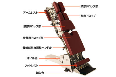 骨盤のゆがみや姿勢の調整などの際に使用します。患者様の身体にかかるストレスを最小限におさえるための最も楽な姿勢を実現。リラックスして頂くことでより細部まで的確な治療に繋げます。